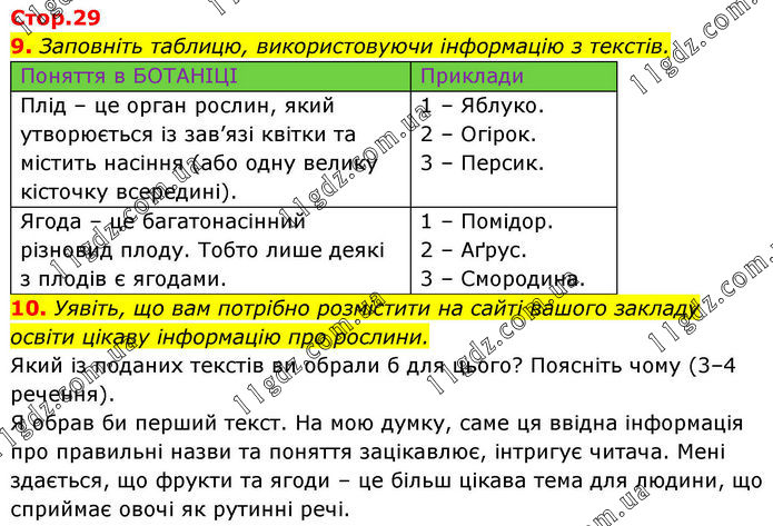 9. Заповніть таблицю, використовуючи інформацію з текстів. Поняття в БОТАНІЦІ Приклади Плід – це орган рослин, який утворюється із зав’язі квітки та містить насіння (або одну велику кісточку всередині). 1 – Яблуко. 2 – Огірок. 3 – Персик. Ягода – це багатонасінний різновид плоду. Тобто лише деякі з плодів є ягодами. 1 – Помідор. 2 – Аґрус. 3 – Смородина. 10. Уявіть, що вам потрібно розмістити на сайті вашого закладу освіти цікаву інформацію про рослини. Який із поданих текстів ви обрали б для цього? Поясніть чому (3–4 речення). Я обрав би перший текст. На мою думку, саме ця ввідна інформація про правильні назви та поняття зацікавлює, інтригує читача. Мені здається, що фрукти та ягоди – це більш цікава тема для людини, що сприймає овочі як рутинні речі.