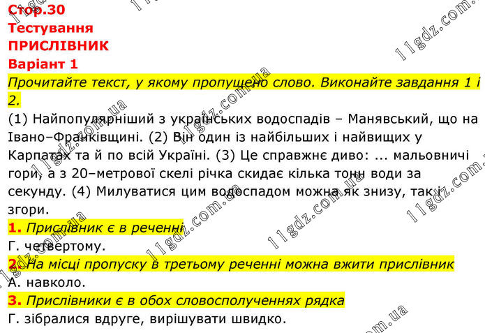Тестування ПРИСЛІВНИК Варіант 1 Прочитайте текст, у якому пропущено слово. Виконайте завдання 1 і 2. (1) Найпопулярніший з українських водоспадів – Манявський, що на Івано–Франківщині. (2) Він один із найбільших і найвищих у Карпатах та й по всій Україні. (3) Це справжнє диво: ... мальовничі гори, а з 20–метрової скелі річка скидає кілька тонн води за секунду. (4) Милуватися цим водоспадом можна як знизу, так і згори. 1. Прислівник є в реченні Г. четвертому. 2. На місці пропуску в третьому реченні можна вжити прислівник А. навколо. 3. Прислівники є в обох словосполученнях рядка Г. зібралися вдруге, вирішувати швидко.