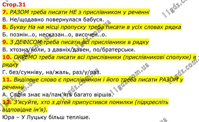 7. РАЗОМ треба писати НЕ з прислівником у реченні В. Не/щодавно повернулася бабуся. 8. Букву На на місці пропуску треба писати в усіх словах рядка Б. позмін..о, несказан..о, височен..о. 9. З ДЕФІСОМ треба писати всі прислівники в рядку В. хтозна/коли, з давніх/давен, по/братерськи. 10. ОКРЕМО треба писати всі прислівники (прислівникові сполуки) в рядку Г. без/сумніву, на/жаль, раз/у/раз. 11. Виділене слово є прислівником і його треба писати РАЗОМ у реченні А. Софія знає на/пам’ять багато віршів. 12. З’ясуйте, хто з дітей припустився помилки (підкресліть відповідне ім’я). Юра – У Луцьку більш тепліше.
