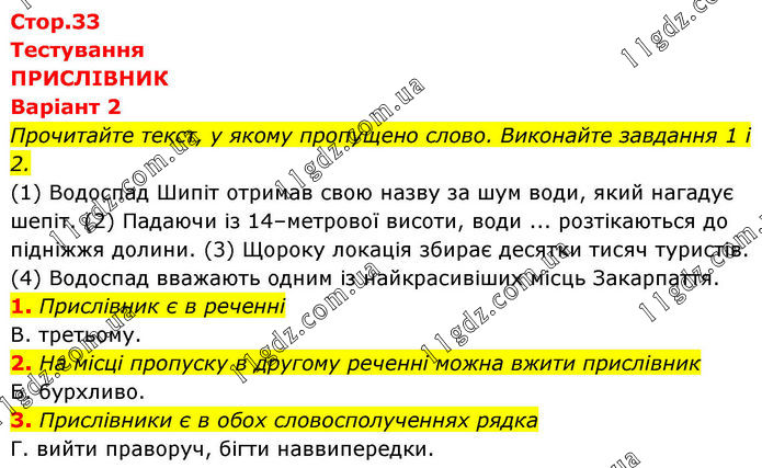 Тестування ПРИСЛІВНИК Варіант 2 Прочитайте текст, у якому пропущено слово. Виконайте завдання 1 і 2. (1) Водоспад Шипіт отримав свою назву за шум води, який нагадує шепіт. (2) Падаючи із 14–метрової висоти, води ... розтікаються до підніжжя долини. (3) Щороку локація збирає десятки тисяч туристів. (4) Водоспад вважають одним із найкрасивіших місць Закарпаття. 1. Прислівник є в реченні В. третьому. 2. На місці пропуску в другому реченні можна вжити прислівник Б. бурхливо. 3. Прислівники є в обох словосполученнях рядка Г. вийти праворуч, бігти наввипередки.