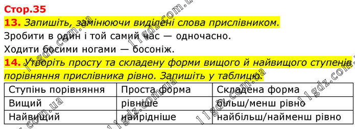 13. Запишіть, замінюючи виділені слова прислівником. Зробити в один і той самий час — одночасно. Ходити босими ногами — босоніж. 14. Утворіть просту та складену форми вищого й найвищого ступенів порівняння прислівника рівно. Запишіть у таблицю. Ступінь порівняння Проста форма Складена форма Вищий рівніше більш/менш рівно Найвищий найрідніше найбільш/найменш рівно