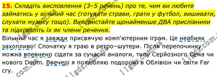 15. Складіть висловлення (3–5 речень) про те, чим ви любите займатись у вільний час (готувати страви, грати у футбол, вишивати, слухати музику тощо). Використайте щонайменше ДВА прислівники та підкресліть їх як члени речення. Вільний час я завжди присвячую комп'ютерним іграм. Це неабияк захопливо! Спочатку я граю в ретро–шутери. Після перепочинку можна впевнено сідати за сучасні аналоги, типу Серйозного Сема чи нового Doom. Ввечері я полюбляю подорожі в Облівіон чи світи Far cry.