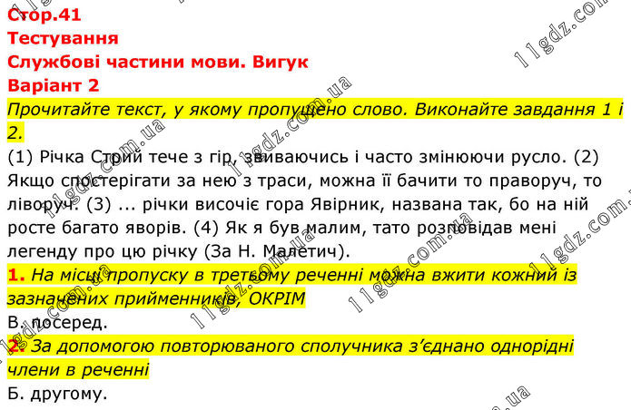 Тестування Службові частини мови. Вигук Варіант 2 Прочитайте текст, у якому пропущено слово. Виконайте завдання 1 і 2. (1) Річка Стрий тече з гір, звиваючись і часто змінюючи русло. (2) Якщо спостерігати за нею з траси, можна її бачити то праворуч, то ліворуч. (3) ... річки височіє гора Явірник, названа так, бо на ній росте багато яворів. (4) Як я був малим, тато розповідав мені легенду про цю річку (За Н. Малетич). 1. На місці пропуску в третьому реченні можна вжити кожний із зазначених прийменників, ОКРІМ В. посеред. 2. За допомогою повторюваного сполучника з’єднано однорідні члени в реченні Б. другому.