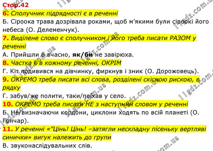 6. Сполучник підрядності є в реченні Б. Сіроока трава дозрівала роками, щоб м’якими були сіроокі його небеса (О. Делеменчук). 7. Виділене слово є сполучником і його треба писати РАЗОМ у реченні А. Прийшли б вчасно, як/би не завірюха. 8. Частка є в кожному реченні, ОКРІМ Г. Кіт подивився на дівчинку, фиркнув і зник (О. Дорожовець). 9. ОКРЕМО треба писати всі слова, розділені скісною рискою, в рядку Г. забув/же полити, таки/поїхав у село. 10. ОКРЕМО треба писати НЕ з наступним словом у реченні Б. Не/визначаючи кордони, циклони ходять по всій планеті (О. Гончар). 11. У реченні «”Цінь! Цінь! –затягли нескладну пісеньку вертляві синички» вигук належить до групи В. звуконаслідувальних слів.