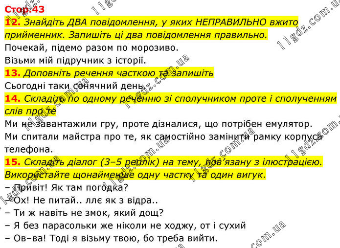12. Знайдіть ДВА повідомлення, у яких НЕПРАВИЛЬНО вжито прийменник. Запишіть ці два повідомлення правильно. Почекай, підемо разом по морозиво. Візьми мій підручник з історії. 13. Доповніть речення часткою та запишіть Сьогодні таки сонячний день. 14. Складіть по одному реченню зі сполучником проте і сполученням слів про те Ми не завантажили гру, проте дізналися, що потрібен емулятор. Ми спитали майстра про те, як самостійно замінити рамку корпуса телефона. 15. Складіть діалог (3–5 реплік) на тему, пов’язану з ілюстрацією. Використайте щонайменше одну частку та один вигук. – Привіт! Як там погодка? – Ох! Не питай.. ллє як з відра.. – Ти ж навіть не змок, який дощ? – Я без парасольки же ніколи не ходжу, от і сухий – Ов–ва! Тоді я візьму твою, бо треба вийти.