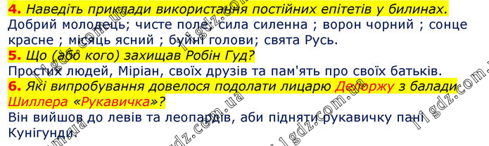 Наведіть приклади використання постійних епітетів у билинах. Що (або кого) захищав Робін Гуд? Які випробування довелося подолати лицарю Делоржу з балади Шиллера «Рукавичка»?