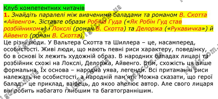Знайдіть паралелі між вивченими баладами та романом В. Скотта «Айвенго». Зіставте образи Робіна Гуда («Як Робін Гуд став розбійником») і Локслі (роман В. Скотта) та Делоржа («Рукавичка») й Айвенго (роман В. Скотта).