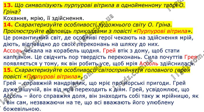 Що символізують пурпурові вітрила в однойменному творі О. Гріна? Схарактеризуйте особливості художнього світу О. Гріна. Проілюструйте відповідь прикладами з повісті «Пурпурові вітрила». Схарактеризуйте особливості світосприйняття головного героя повісті «Пурпурові вітрила».