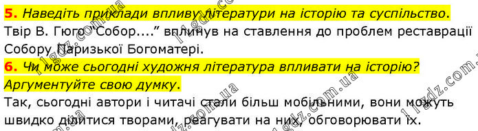 5. Наведіть приклади впливу літератури на історію та суспільство. Твір В. Гюго “Собор....” вплинув на ставлення до проблем реставрації Собору Паризької Богоматері. 6. Чи може сьогодні художня література впливати на історію? Аргументуйте свою думку. Так, сьогодні автори і читачі стали більш мобільними, вони можуть швидко ділитися творами, реагувати на них, обговорювати їх.