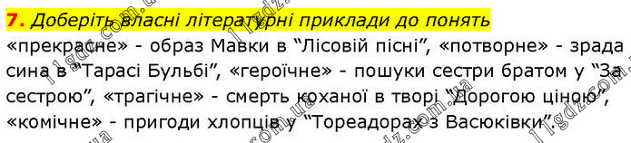 Доберіть власні літературні приклади до понять «прекрасне» - образ Мавки в “Лісовій пісні”, «потворне» - зрада сина в “Тарасі Бульбі”, «героїчне» - пошуки сестри братом у “За сестрою”, «трагічне» - смерть коханої в творі “Дорогою ціною”, «комічне» - пригоди хлопців у “Тореадорах з Васюківки”.