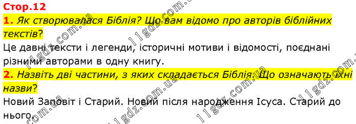1. Як створювалася Біблія? Що вам відомо про авторів біблійних текстів? Це давні тексти і легенди, історичні мотиви і відомості, поєднані різними авторами в одну книгу. 2. Назвіть дві частини, з яких складається Біблія. Що означають їхні назви? Новий Заповіт і Старий. Новий після народження Ісуса. Старий до нього.