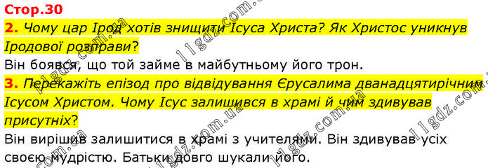 2. Чому цар Ірод хотів знищити Ісуса Христа? Як Христос уникнув Іродової розправи? Він боявся, що той займе в майбутньому його трон. 3. Перекажіть епізод про відвідування Єрусалима дванадцятирічним Ісусом Христом. Чому Ісус залишився в храмі й чим здивував присутніх? Він вирішив залишитися в храмі з учителями. Він здивував усіх своєю мудрістю. Батьки довго шукали його.