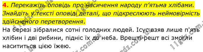 Перекажіть оповідь про насичення народу п’ятьма хлібами. Знайдіть у тексті оповіді деталі, що підкреслюють неймовірність здійсненого перетворення. На березі зібралися сотні голодних людей. Ісус взяв лише п'ять хлібин і дві рибини, підніс їх до неба. Врешті-решт всі змогли насититься цією їжею.