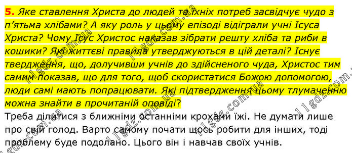 Яке ставлення Христа до людей та їхніх потреб засвідчує чудо з п’ятьма хлібами? А яку роль у цьому епізоді відіграли учні Ісуса Христа? Чому Ісус Христос наказав зібрати решту хліба та риби в кошики? Які життєві правила утверджуються в цій деталі? Існує твердження, що, долучивши учнів до здійсненого чуда, Христос тим самим показав, що для того, щоб скористатися Божою допомогою, люди самі мають попрацювати. Які підтвердження цьому тлумаченню можна знайти в прочитаній оповіді? Треба ділитися з ближніми останніми крохами їжі. Не думати лише про свій голод. Варто самому почати щось робити для інших, тоді проблему буде подолано. Цього він і навчав своїх учнів.
