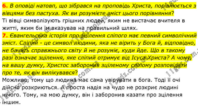 6. В оповіді натовп, що зібрався на проповідь Христа, порівнюється з вівцями без пастуха. Як ви розумієте зміст цього порівняння? Ті вівці символізують грішних людей, яким не вистачає вчителя в житті, яким би їм вказував на правильний шлях. 7. Євангельська історія про зцілення сліпого має певний символічний зміст. Сліпий - це символ людини, яка не вірить у Бога й, відповідно, не бачить справжнього світу й не розуміє, куди йде. Що в такому разі означає зцілення, яке сліпий отримує від Ісуса Христа? А чому, на вашу думку, Христос заборонив зціленому сліпому розповідати про те, як він вилікувався? Можливо, тому що людина має сама увірувати в бога. Тоді її очі дійсно розкриються. А проста надія на чудо не розкриє людині нічого. Тому, на мою думку, він і заборонив казати про зцілення іншим.