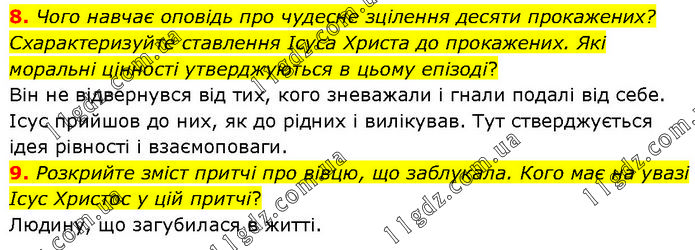 8. Чого навчає оповідь про чудесне зцілення десяти прокажених? Схарактеризуйте ставлення Ісуса Христа до прокажених. Які моральні цінності утверджуються в цьому епізоді? Він не відвернувся від тих, кого зневажали і гнали подалі від себе. Ісус прийшов до них, як до рідних і вилікував. Тут стверджується ідея рівності і взаємоповаги. 9. Розкрийте зміст притчі про вівцю, що заблукала. Кого має на увазі Ісус Христос у цій притчі? Людину, що загубилася в житті.