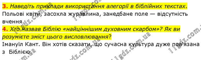 3. Наведіть приклади використання алегорії в біблійних текстах. Польові квіти, засохла журавлина, занедбане поле — відсутність вчення. 4. Хто назвав Біблію «найціннішим духовним скарбом»? Як ви розумієте зміст цього висловлювання? Імануїл Кант. Він хотів сказати, що сучасна культура дуже пов'язана з Біблією.