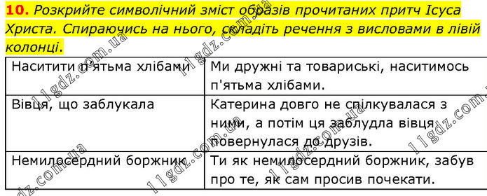 Розкрийте символічний зміст образів прочитаних притч Ісуса Христа. Спираючись на нього, складіть речення з висловами в лівій колонці. Наситити п’ятьма хлібами Ми дружні та товариські, наситимось п'ятьма хлібами. Вівця, що заблукала Катерина довго не спілкувалася з ними, а потім ця заблудла вівця повернулася до друзів. Немилосердний боржник Ти як немилосердний боржник, забув про те, як сам просив почекати.