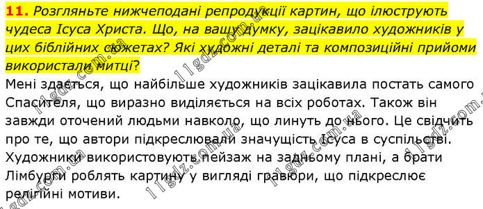 Розгляньте нижчеподані репродукції картин, що ілюструють чудеса Ісуса Христа. Що, на вашу думку, зацікавило художників у цих біблійних сюжетах? Які художні деталі та композиційні прийоми використали митці? Мені здається, що найбільше художників зацікавила постать самого Спасителя, що виразно виділяється на всіх роботах. Також він завжди оточений людьми навколо, що линуть до нього. Це свідчить про те, що автори підкреслювали значущість Ісуса в суспільстві. Художники використовують пейзаж на задньому плані, а брати Лімбурги роблять картину у вигляді гравюри, що підкреслює релігійні мотиви.