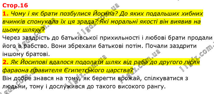 1. Чому і як брати позбулися Йосипа? До яких подальших хибних вчинків спонукала їх ця зрада? Які моральні якості він виявив на цьому шляху? Через заздрість до батьківської прихильності і любові брати продали його в рабство. Вони збрехали батькові потім. Почали заздрити іншому братові. 2. Як Йосипові вдалося подолати шлях від раба до другого після фараона правителя Єгипетського царства? Він добре знався на тому, як берегти врожай, спілкуватися з людьми, тому і дослужився до такого високого рангу.
