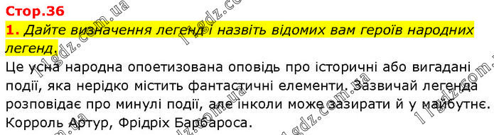 Дайте визначення легенд і назвіть відомих вам героїв народних легенд. Це усна народна опоетизована оповідь про історичні або вигадані події, яка нерідко містить фантастичні елементи. Зазвичай легенда розповідає про минулі події, але інколи може зазирати й у майбутнє. Корроль Артур, Фрідріх Барбароса.