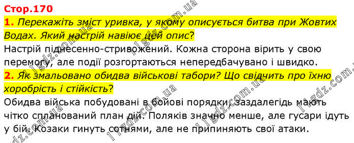 1. Перекажіть зміст уривка, у якому описується битва при Жовтих Водах. Який настрій навіює цей опис? Настрій піднесенно-стривожений. Кожна сторона вірить у свою перемогу, але події розгортаються непередбачувано і швидко. 2. Як змальовано обидва військові табори? Що свідчить про їхню хоробрість і стійкість? Обидва війська побудовані в бойові порядки, заздалегідь мають чітко спланований план дій. Поляків значно менше, але гусари ідуть у бій. Козаки гинуть сотнями, але не припиняють свої атаки.