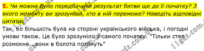 5. Чи можна було передбачити результат битви ще до її початку? З якого моменту ви зрозуміли, хто в ній переможе? Наведіть відповідні цитати. Так, бо більшість була на стороні українського війська, і погодні умови також. Це було зрозуміло з самого початку. “Тільки степ розмокне...вони в болота потонуть”.