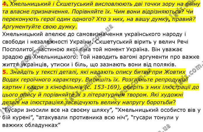 4. Хмельницький і Скшетуський висловлюють дві точки зору на війну та власне призначення. Порівняйте їх. Чим вони відрізняються? Чи переконують герої один одного? Хто з них, на вашу думку, правий? Аргументуйте свою думку. Хмельницький апелює до самовизначення українського народу і свободи і незалежності України. Скшетуський вірить у велич Речі Посполитої, частиною якої є на той момент Україна. Він уважає зрадою дії Хмельницького. Той наводить вагомі аргументи про важке життя українців, утиски і біль, що зазнають вони від поляків. 5. Знайдіть у тексті деталі, які надають опису битви при Жовтих Водах героїчного характеру. Випишіть їх. Розгляньте репродукції картин і кадри з кінофільмів (с. 153-169), оберіть з них ілюстрації до цього опису й порівняйте їх з літературним твором. Які художні деталі на ілюстраціях засвідчують велику напругу боротьби? “Гусари зносили все на своєму шляху”, “Хмельницький особисто вів у бій курені”, “атакували противника всю ніч”, “гусари тонули у важких обладунках”.
