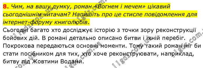Чим, на вашу думку, роман «Вогнем і мечем» цікавий сьогоднішнім читачам? Напишіть про це стисле повідомлення для інтернет-форуму книголюбів. Сьогодні багато хто досліджує історію з точки зору реконструкції бойових дій. В романі детально описано битви і їхній перебіг. Покрокова передаються основні моменти. Тому такий роман міг би стати посібником для тих, хто хоче реконструювати, наприклад, битву під Жовтими Водами.