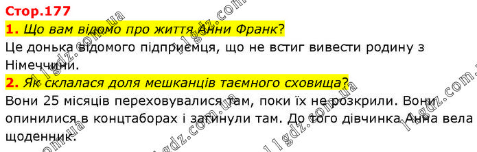 1. Що вам відомо про життя Анни Франк? Це донька відомого підприємця, що не встиг вивести родину з Німеччини. 2. Як склалася доля мешканців таємного сховища? Вони 25 місяців переховувалися там, поки їх не розкрили. Вони опинилися в концтаборах і загинули там. До того дівчинка Анна вела щоденник.