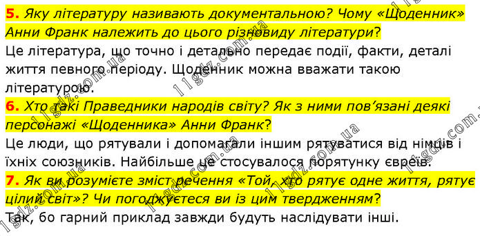 5. Яку літературу називають документальною? Чому «Щоденник» Анни Франк належить до цього різновиду літератури? Це література, що точно і детально передає події, факти, деталі життя певного періоду. Щоденник можна вважати такою літературою. 6. Хто такі Праведники народів світу? Як з ними пов’язані деякі персонажі «Щоденника» Анни Франк? Це люди, що рятували і допомагали іншим рятуватися від німців і їхніх союзників. Найбільше це стосувалося порятунку євреїв. 7. Як ви розумієте зміст речення «Той, хто рятує одне життя, рятує цілий світ»? Чи погоджуєтеся ви із цим твердженням? Так, бо гарний приклад завжди будуть наслідувати інші.