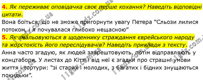 4. Як переживає оповідачка своє перше кохання? Наведіть відповідні цитати. Вона боїться, що не зможе пригорнути увагу Петера “Сльози лилися потоком, і я почувалася глибоко нещасною” 5. Як змальовуються в щоденнику страждання єврейського народу та жорстокість його переслідувачів? Наведіть приклади з тексту. Анна часто згадую, як людей заарештовують, потім відправляють у концтабори. У листах до Кітті і від неї є згадки про страшні умови життя і тортури: “зі старих і молодих, з багатих і бідних знущаються покидьки”.