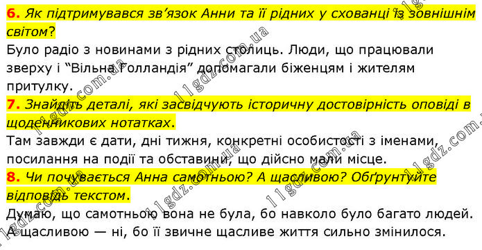 6. Як підтримувався зв’язок Анни та її рідних у схованці із зовнішнім світом? Було радіо з новинами з рідних столиць. Люди, що працювали зверху і “Вільна Голландія” допомагали біженцям і жителям притулку. 7. Знайдіть деталі, які засвідчують історичну достовірність оповіді в щоденникових нотатках. Там завжди є дати, дні тижня, конкретні особистості з іменами, посилання на події та обставини, що дійсно мали місце. 8. Чи почувається Анна самотньою? А щасливою? Обґрунтуйте відповідь текстом. Думаю, що самотньою вона не була, бо навколо було багато людей. А щасливою — ні, бо її звичне щасливе життя сильно змінилося.
