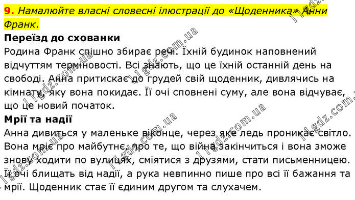 Намалюйте власні словесні ілюстрації до «Щоденника» Анни Франк. Переїзд до схованки Родина Франк спішно збирає речі. Їхній будинок наповнений відчуттям терміновості. Всі знають, що це їхній останній день на свободі. Анна притискає до грудей свій щоденник, дивлячись на кімнату, яку вона покидає. Її очі сповнені суму, але вона відчуває, що це новий початок. Мрії та надії Анна дивиться у маленьке віконце, через яке ледь проникає світло. Вона мріє про майбутнє, про те, що війна закінчиться і вона зможе знову ходити по вулицях, сміятися з друзями, стати письменницею. Її очі блищать від надії, а рука невпинно пише про всі її бажання та мрії. Щоденник стає її єдиним другом та слухачем.