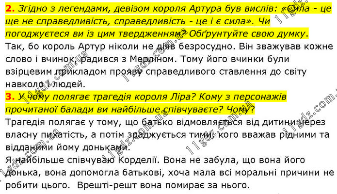 2. Згідно з легендами, девізом короля Артура був вислів: «Сила - це ще не справедливість, справедливість - це і є сила». Чи погоджуєтеся ви із цим твердженням? Обґрунтуйте свою думку. Так, бо король Артур ніколи не діяв безросудно. Він зважував кожне слово і вчинок, радився з Мерліном. Тому його вчинки були взірцевим прикладом прояву справедливого ставлення до світу навколо і людей. 3. У чому полягає трагедія короля Ліра? Кому з персонажів прочитаної балади ви найбільше співчуваєте? Чому? Трагедія полягає у тому, що батько відмовляється від дитини через власну пихатість, а потім зраджується тими, кого вважав рідними та відданими йому доньками. Я найбільше співчуваю Корделії. Вона не забула, що вона його донька, вона допомогла батькові, хоча мала всі моральні причини не робити цього. Врешті-решт вона помирає за нього.