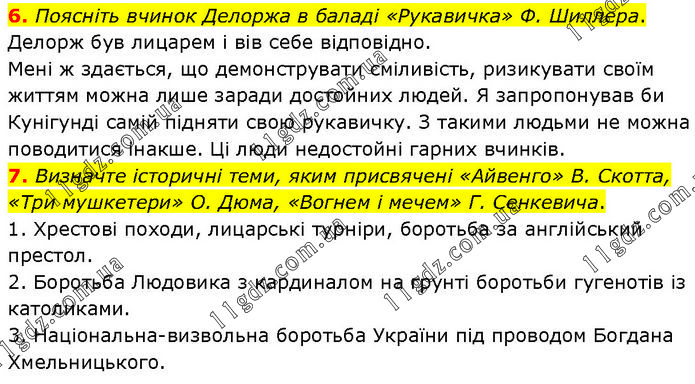 6. Поясніть вчинок Делоржа в баладі «Рукавичка» Ф. Шиллера. Делорж був лицарем і вів себе відповідно. Мені ж здається, що демонструвати сміливість, ризикувати своїм життям можна лише заради достойних людей. Я запропонував би Кунігунді самій підняти свою рукавичку. З такими людьми не можна поводитися інакше. Ці люди недостойні гарних вчинків. 7. Визначте історичні теми, яким присвячені «Айвенго» В. Скотта, «Три мушкетери» О. Дюма, «Вогнем і мечем» Г. Сенкевича. 1. Хрестові походи, лицарські турніри, боротьба за англійський престол. 2. Боротьба Людовика з кардиналом на грунті боротьби гугенотів із католиками. 3. Національна-визвольна боротьба України під проводом Богдана Хмельницького.