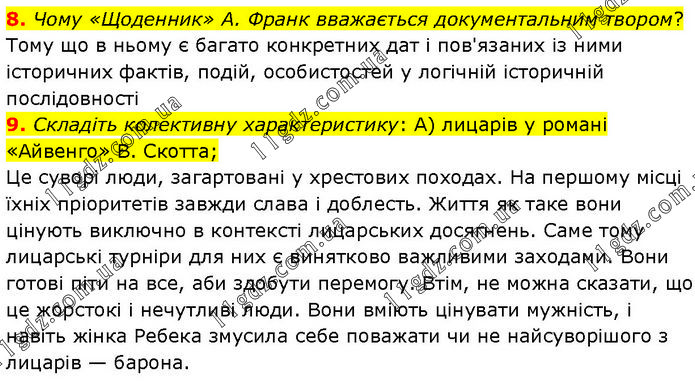 8. Чому «Щоденник» А. Франк вважається документальним твором? Тому що в ньому є багато конкретних дат і пов'язаних із ними історичних фактів, подій, особистостей у логічній історичній послідовності 9. Складіть колективну характеристику: А) лицарів у романі «Айвенго» В. Скотта; Це суворі люди, загартовані у хрестових походах. На першому місці їхніх пріоритетів завжди слава і доблесть. Життя як таке вони цінують виключно в контексті лицарських досягнень. Саме тому лицарські турніри для них є винятково важливими заходами. Вони готові піти на все, аби здобути перемогу. Втім, не можна сказати, що це жорстокі і нечутливі люди. Вони вміють цінувати мужність, і навіть жінка Ребека змусила себе поважати чи не найсуворішого з лицарів — барона.