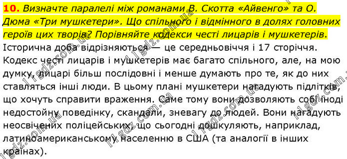 Визначте паралелі між романами В. Скотта «Айвенго» та О. Дюма «Три мушкетери». Що спільного і відмінного в долях головних героїв цих творів? Порівняйте кодекси честі лицарів і мушкетерів. Історична доба відрізняються — це середньовіччя і 17 сторіччя. Кодекс честі лицарів і мушкетерів має багато спільного, але, на мою думку, лицарі більш послідовні і менше думають про те, як до них ставляться інші люди. В цьому плані мушкетери нагадують підлітків, що хочуть справити враження. Саме тому вони дозволяють собі іноді недостойну поведінку, скандали, зневагу до людей. Вони нагадують неосвічених поліцейських, що сьогодні дошкуляють, наприклад, латиноамериканському населенню в США (та аналогії в інших країнах).