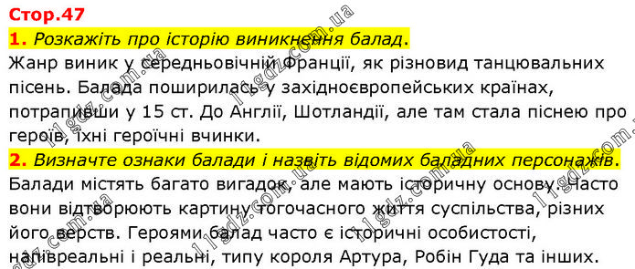 1. Розкажіть про історію виникнення балад. Жанр виник у середньовічній Франції, як різновид танцювальних пісень. Балада поширилась у західноєвропейських країнах, потрапивши у 15 ст. До Англії, Шотландії, але там стала піснею про героїв, їхні героїчні вчинки. 2. Визначте ознаки балади і назвіть відомих баладних персонажів. Балади містять багато вигадок, але мають історичну основу. Часто вони відтворюють картину тогочасного життя суспільства, різних його верств. Героями балад часто є історичні особистості, напівреальні і реальні, типу короля Артура, Робін Гуда та інших.