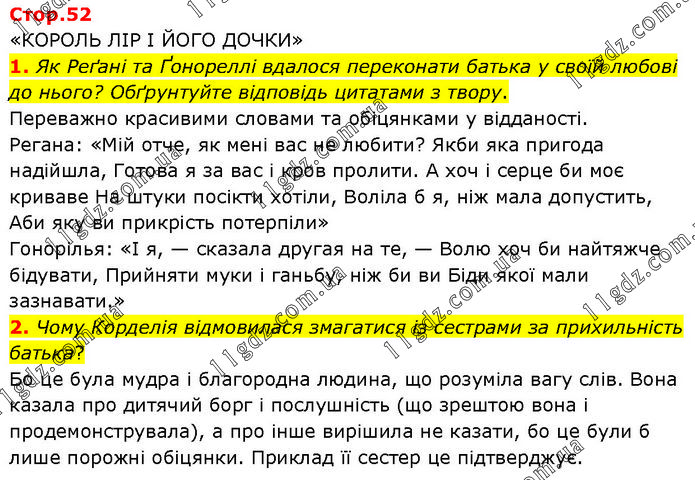 «КОРОЛЬ ЛІР І ЙОГО ДОЧКИ» 1. Як Реґані та Ґонореллі вдалося переконати батька у своїй любові до нього? Обґрунтуйте відповідь цитатами з твору. Переважно красивими словами та обіцянками у відданості. Регана: «Мій отче, як мені вас не любити? Якби яка пригода надійшла, Готова я за вас і кров пролити. А хоч і серце би моє криваве На штуки посікти хотіли, Воліла б я, ніж мала допустить, Аби яку ви прикрість потерпіли» Гонорілья: «І я, — сказала другая на те, — Волю хоч би найтяжче бідувати, Прийняти муки і ганьбу, ніж би ви Біди якої мали зазнавати.» 2. Чому Корделія відмовилася змагатися із сестрами за прихильність батька? Бо це була мудра і благородна людина, що розуміла вагу слів. Вона казала про дитячий борг і послушність (що зрештою вона і продемонструвала), а про інше вирішила не казати, бо це були б лише порожні обіцянки. Приклад її сестер це підтверджує.