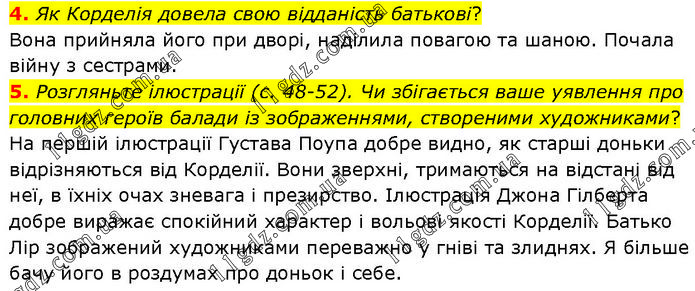 4. Як Корделія довела свою відданість батькові? Вона прийняла його при дворі, наділила повагою та шаною. Почала війну з сестрами. 5. Розгляньте ілюстрації (с. 48-52). Чи збігається ваше уявлення про головних героїв балади із зображеннями, створеними художниками? На першій ілюстрації Густава Поупа добре видно, як старші доньки відрізняються від Корделії. Вони зверхні, тримаються на відстані від неї, в їхніх очах зневага і презирство. Ілюстрація Джона Гілберта добре виражає спокійний характер і вольові якості Корделії. Батько Лір зображений художниками переважно у гніві та злиднях. Я більше бачу його в роздумах про доньок і себе.