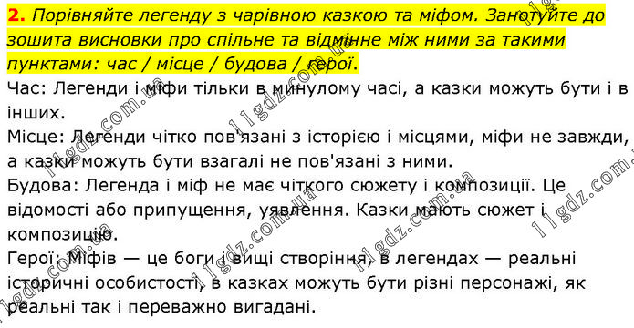Порівняйте легенду з чарівною казкою та міфом. Занотуйте до зошита висновки про спільне та відмінне між ними за такими пунктами: час / місце / будова / герої. Час: Легенди і міфи тільки в минулому часі, а казки можуть бути і в інших. Місце: Легенди чітко пов'язані з історією і місцями, міфи не завжди, а казки можуть бути взагалі не пов'язані з ними. Будова: Легенда і міф не має чіткого сюжету і композиції. Це відомості або припущення, уявлення. Казки мають сюжет і композицію. Герої: Міфів — це боги і вищі створіння, в легендах — реальні історичні особистості, в казках можуть бути різні персонажі, як реальні так і переважно вигадані.