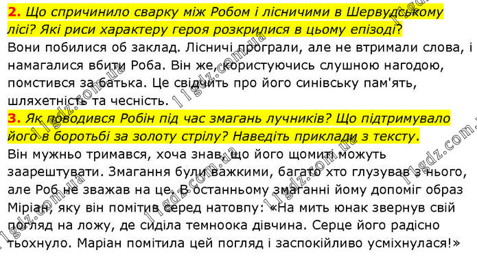 2. Що спричинило сварку між Робом і лісничими в Шервудському лісі? Які риси характеру героя розкрилися в цьому епізоді? Вони побилися об заклад. Лісничі програли, але не втримали слова, і намагалися вбити Роба. Він же, користуючись слушною нагодою, помстився за батька. Це свідчить про його синівську пам'ять, шляхетність та чесність. 3. Як поводився Робін під час змагань лучників? Що підтримувало його в боротьбі за золоту стрілу? Наведіть приклади з тексту. Він мужньо тримався, хоча знав, що його щомиті можуть заарештувати. Змагання були важкими, багато хто глузував з нього, але Роб не зважав на це. В останньому змаганні йому допоміг образ Міріан, яку він помітив серед натовпу: «На мить юнак звернув свій погляд на ложу, де сиділа темноока дівчина. Серце його радісно тьохнуло. Маріан помітила цей погляд і заспокійливо усміхнулася!»