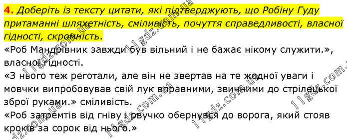Доберіть із тексту цитати, які підтверджують, що Робіну Гуду притаманні шляхетність, сміливість, почуття справедливості, власної гідності, скромність. «Роб Мандрівник завжди був вільний і не бажає нікому служити.», власної гідності. «З нього теж реготали, але він не звертав на те жодної уваги і мовчки випробовував свій лук вправними, звичними до стрілецької зброї руками.» сміливість. «Роб затремтів від гніву і рвучко обернувся до ворога, який стояв кроків за сорок від нього.»