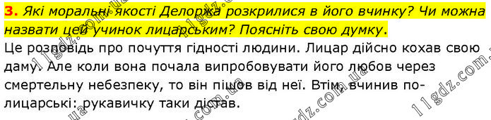 Які моральні якості Делоржа розкрилися в його вчинку? Чи можна назвати цей учинок лицарським? Поясніть свою думку. Це розповідь про почуття гідності людини. Лицар дійсно кохав свою даму. Але коли вона почала випробовувати його любов через смертельну небезпеку, то він пішов від неї. Втім, вчинив по-лицарські: рукавичку таки дістав.