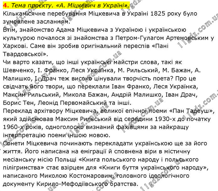 Тема проєкту. «А. Міцкевич в Україні». Кількамісячне перебування Міцкевича в Україні 1825 року було зумовлене засланням. Втім, знайомство Адама Міцкевича з Україною і українською культурою почалося зі знайомства з Петром-Гулагом Артемовським у Харкові. Саме він зробив оригінальний переспів «Пані Твардовської». Чи варто казати, що інші українські майстри слова, такі як Шевченко, І. Франко, Леся Українка, М. Рильський, М. Бажан, А. Малишко, І. Драч теж високо цінували творчість поета? Про це свідчать його твори, що переклали Іван Франко, Леся Українка, Максим Рильський, Микола Бажан, Андрій Малишко, Іван Драч, Борис Тен, Леонід Первомайський та інші. Переклад архітвору Міцкевича, великої епічної поеми «Пан Тадеуш», який здійснював Максим Рильський від середини 1930-х до початку 1960-х років, одноголосно визнаний фахівцями за найкращу інтерпретацію поеми іншою мовою. Сонети Міцкевича починають перекладати українською ще за його життя. Його написана на еміграції й сповнена віри в містичну месіанську місію Польщі «Книга польського народу і польського пілігримства» стає взірцем для «Книги буття українського народу», написаного Миколою Костомаровим, головного ідеологічного документу Кирило-Мефодіївського братства.