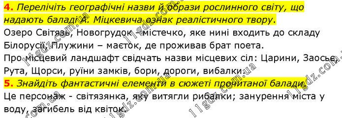 4. Перелічіть географічні назви й образи рослинного світу, що надають баладі А. Міцкевича ознак реалістичного твору. Озеро Світязь, Новогрудок - містечко, яке нині входить до складу Білорусії, Плужини – маєток, де проживав брат поета. Про місцевий ландшафт свідчать назви місцевих сіл: Царини, Заосьє, Рута, Щорси, руїни замків, бори, дороги, вибалки. 5. Знайдіть фантастичні елементи в сюжеті прочитаної балади. Це персонаж - світязянка, яку витягли рибалки; занурення міста у воду, загибель від квіток.