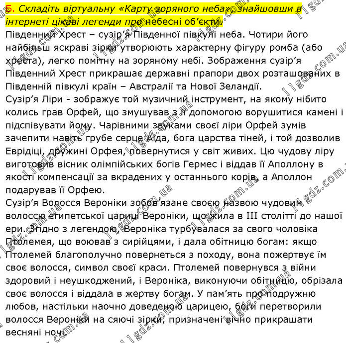 Складіть віртуальну «Карту зоряного неба», знайшовши в інтернеті цікаві легенди про небесні об’єкти. Південний Хрест – сузір’я Південної півкулі неба. Чотири його найбільш яскраві зірки утворюють характерну фігуру ромба (або хреста), легко помітну на зоряному небі. Зображення сузір’я Південний Хрест прикрашає державні прапори двох розташованих в Південній півкулі країн – Австралії та Нової Зеландії. Сузір’я Ліри - зображує той музичний інструмент, на якому нібито колись грав Орфей, що змушував з її допомогою ворушитися камені і підспівувати йому. Чарівними звуками своєї ліри Орфей зумів зачепити навіть грубе серце Аїда, бога царства тіней, і той дозволив Еврідіці, дружині Орфея, повернутися у світ живих. Цю чудову ліру виготовив вісник олімпійських богів Гермес і віддав її Аполлону в якості компенсації за вкрадених у останнього корів, а Аполлон подарував її Орфею. Сузір’я Волосся Вероніки зобов’язане своєю назвою чудовим волоссю єгипетської цариці Вероніки, що жила в III столітті до нашої ери. Згідно з легендою, Вероніка турбувалася за свого чоловіка Птолемея, що воював з сирійцями, і дала обітницю богам: якщо Птолемей благополучно повернеться з походу, вона пожертвує їм своє волосся, символ своєї краси. Птолемей повернувся з війни здоровий і неушкоджений, і Вероніка, виконуючи обітницю, обрізала своє волосся і віддала в жертву богам. У пам’ять про подружню любов, настільки наочно доведеною царицею, боги перетворили волосся Вероніки на сяючі зірки, призначені вічно прикрашати весняні ночі.