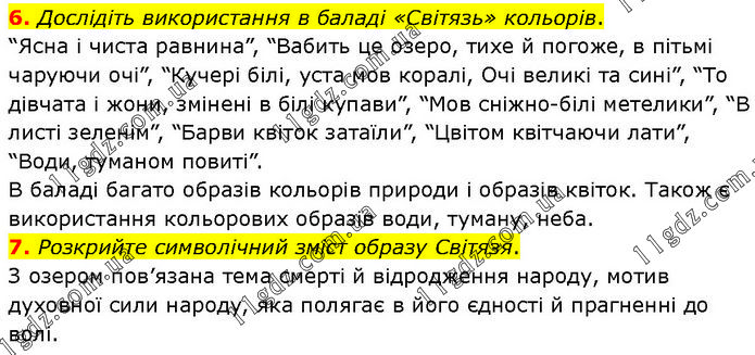 6. Дослідіть використання в баладі «Світязь» кольорів. “Ясна і чиста равнина”, “Вабить це озеро, тихе й погоже, в пітьмі чаруючи очі”, “Кучері білі, уста мов коралі, Очі великі та сині”, “То дівчата і жони, змінені в білі купави”, “Мов сніжно-білі метелики”, “В листі зеленім”, “Барви квіток затаїли”, “Цвітом квітчаючи лати”, “Води, туманом повиті”. В баладі багато образів кольорів природи і образів квіток. Також є використання кольорових образів води, туману, неба. 7. Розкрийте символічний зміст образу Світязя. З озером пов’язана тема смерті й відродження народу, мотив духовної сили народу, яка полягає в його єдності й прагненні до волі.
