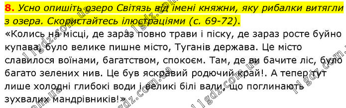 Усно опишіть озеро Світязь від імені княжни, яку рибалки витягли з озера. Скористайтесь ілюстраціями (с. 69-72). «Колись на місці, де зараз повно трави і піску, де зараз росте буйно купава, було велике пишне місто, Туганів держава. Це місто славилося воїнами, багатством, спокоєм. Там, де ви бачите ліс, було багато зелених нив. Це був яскравий родючий край!. А тепер тут лише холодні глибокі води і великі білі вали, що поглинають зухвалих мандрівників!»
